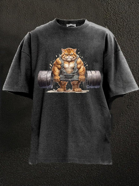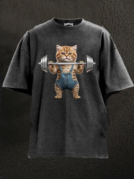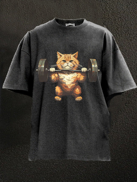 Weightlifting Cat Washed Gym Shirt