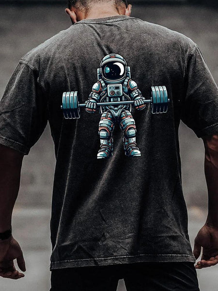 barbell weightlifting astronaut back printed Washed Gym Shirt
