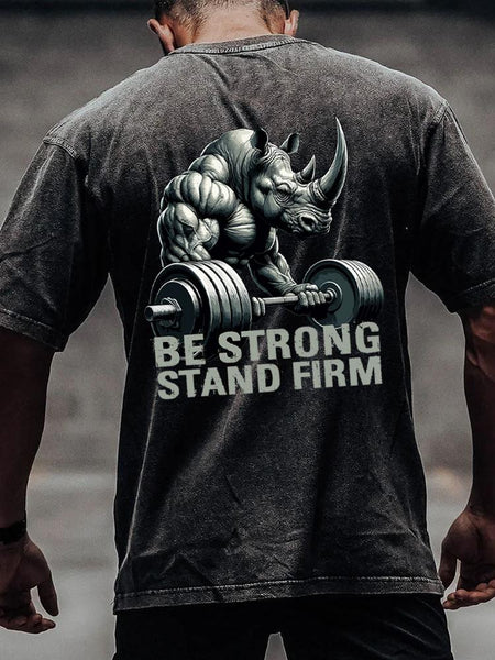be strong stand firm muscular rhino back printed Washed Gym Shirt