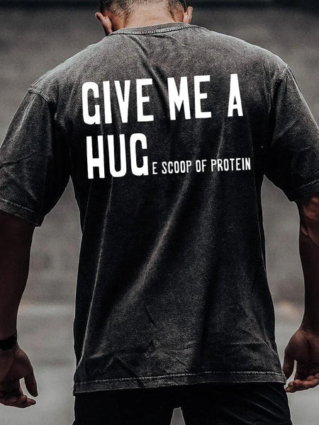 GIVE ME A HUG-E SCOOP OF PROTEIN back printed Washed Gym Shirt