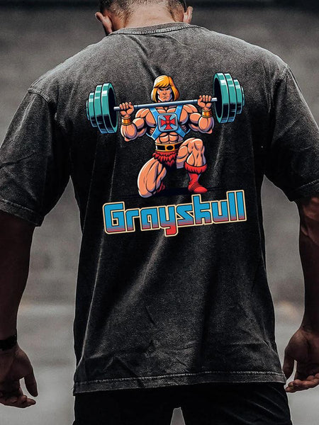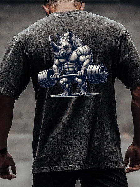 BARBELL WEIGHTLIFTING RHINO back printed Washed Gym Shirt