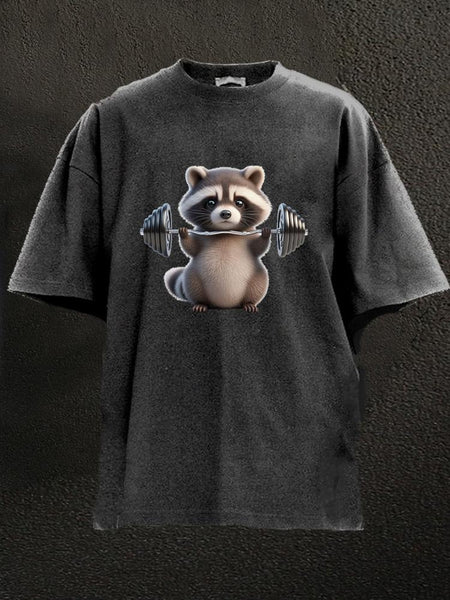 barbell weightlifting raccoon Washed Gym Shirt
