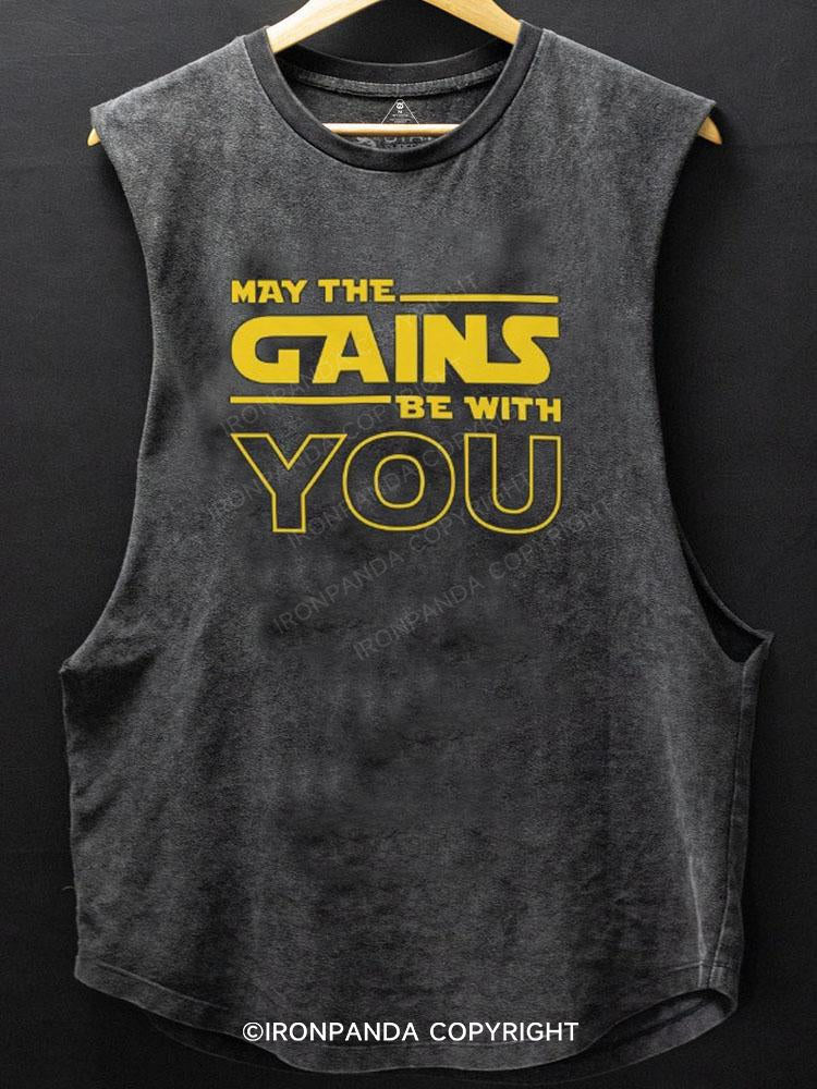 DESIGN: Sometimes the specialty of the item is within its name. Introducing May the Gains Be With You Scoop Bottom Cotton IronPanda Tank. Cut deeper on the shoulders to showcase the delts from all angles. They are made with soft cotton and stretchy lycra fabric, straight bottom hem cut, May the Gains Be With You letters printed on the chest.