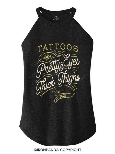 TATTOOS PRETTY EYES AND THICK THIGHS TRI ROCKER COTTON TANK