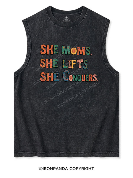 SHE MOMS. SHE LIFTS. SHE CONQUERS Washed Tank