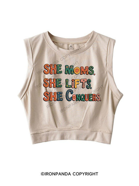 SHE MOMS. SHE LIFTS. SHE CONQUERS SLEEVELESS CROP TOPS