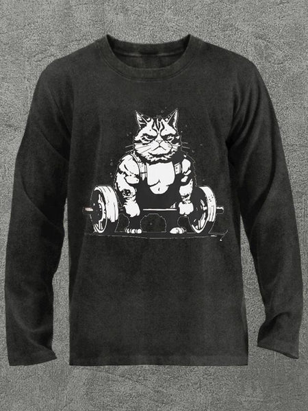 weightlifting cat Washed Gym Long Sleeve Shirt