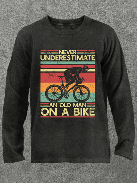 Never Underestimate an Old Man On a Bike Washed Gym Long Sleeve Shirt