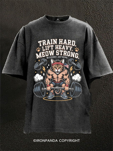 TRAIN HARD LIFT HEAVY MEOW STRONG Washed Gym Shirt
