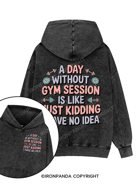 A DAY WITHOUT GYM SESSION IS LIKE JUST KIDDING I HAVE NO IDEA Printed Washed Gym Hoodie