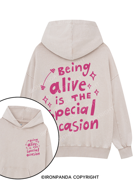 BEING ALIVE IS THE SPECIAL OCCASION Printed Washed Gym Hoodie