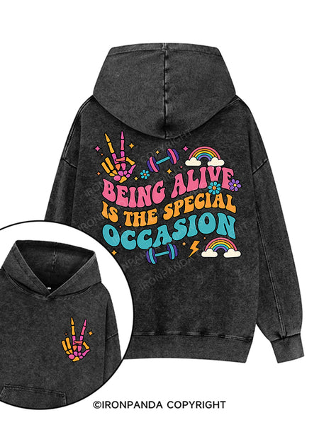 BEING ALIVE IS THE SPECIAL OCCASION Printed Washed Gym Hoodie