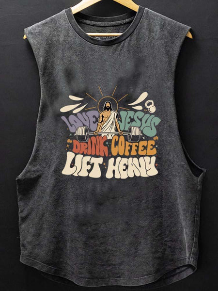 LOVE JESUS DRINK COFFEE LIFT HEAVY SCOOP BOTTOM COTTON TANK