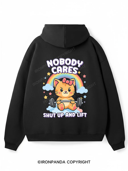 NOBODY CARES — SHUT UP AND LIFT Premium Fleece Gym Hoodie