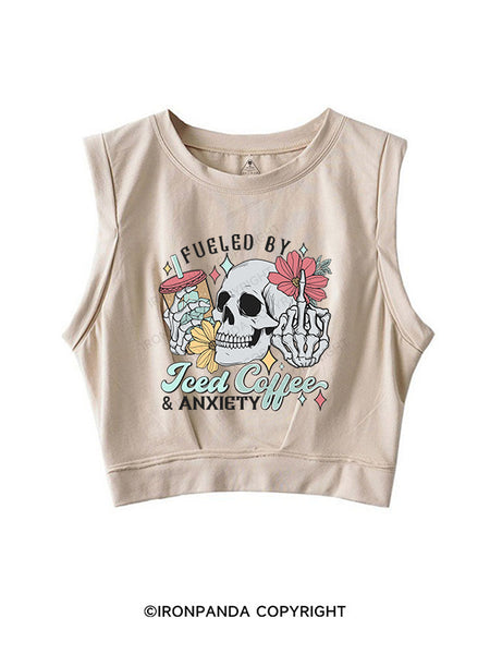 FUELED BY ICED COFFEE AND ANXIETY SLEEVELESS CROP TOPS