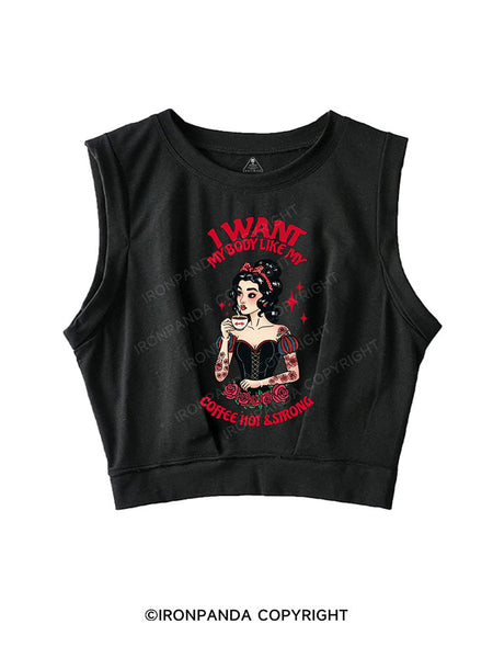 I WANT MY BODY LIKE MY COFFEE HOT & STRONG SLEEVELESS CROP TOPS