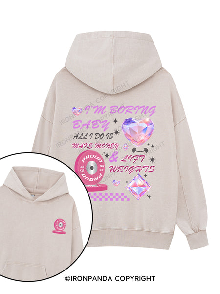 I'M BORING BABY, ALL I DO IS MAKE MONEY & LIFT WEIGHTS Printed Washed Gym Hoodie