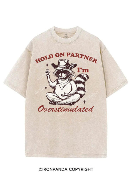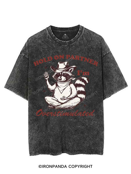 HOLD ON PARTNER I'M OVERSTIMULATED VINTAGE GYM SHIRT