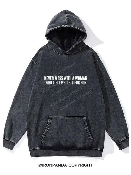 Never Mess With A Woman Who Lifts Weights For Fun WASHED GYM HOODIE