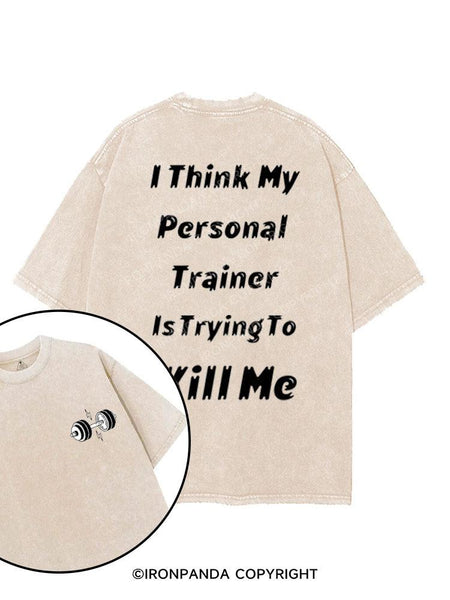 I THINK MY PERSONAL TRAINER IS TRYING TO KILL ME printed Gym Shirt