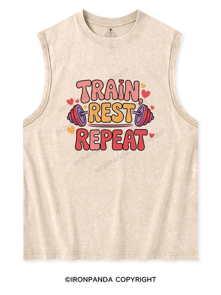 TRAIN, REST, REPEAT SLEEVELESS CROP TOPS