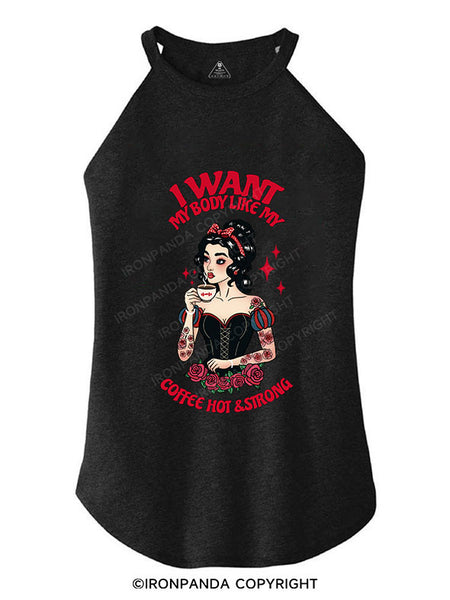 I WANT MY BODY LIKE MY COFFEE HOT & STRONG TRI ROCKER COTTON TANK