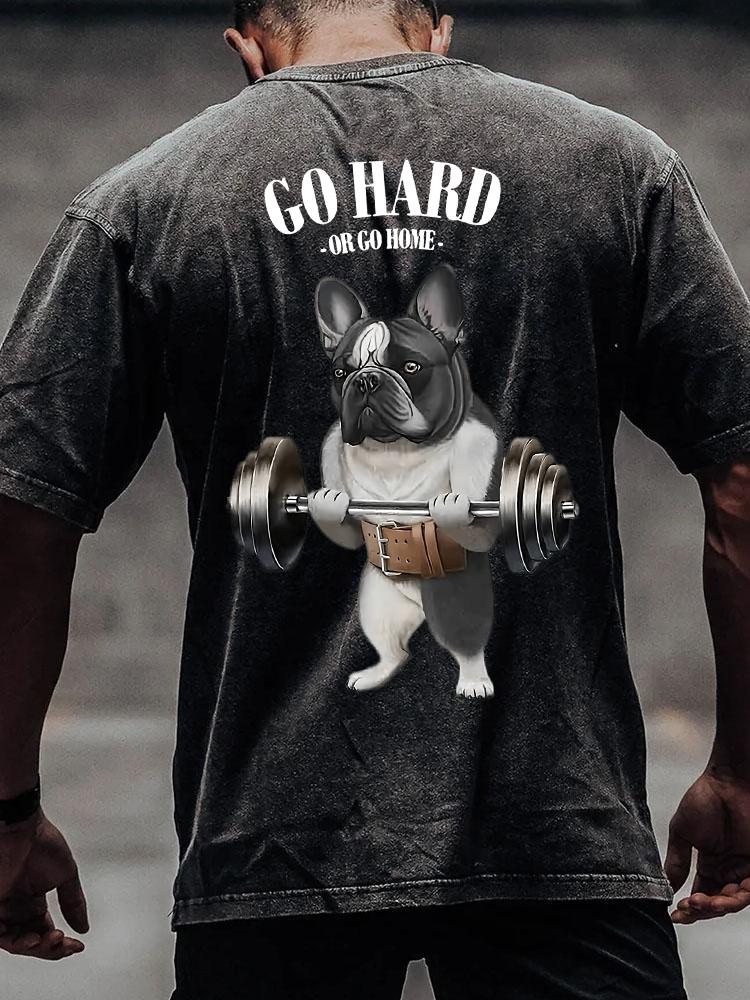 GO HARD OR GO HOME FRENCH BULL DOG back printed Washed Gym Shirt