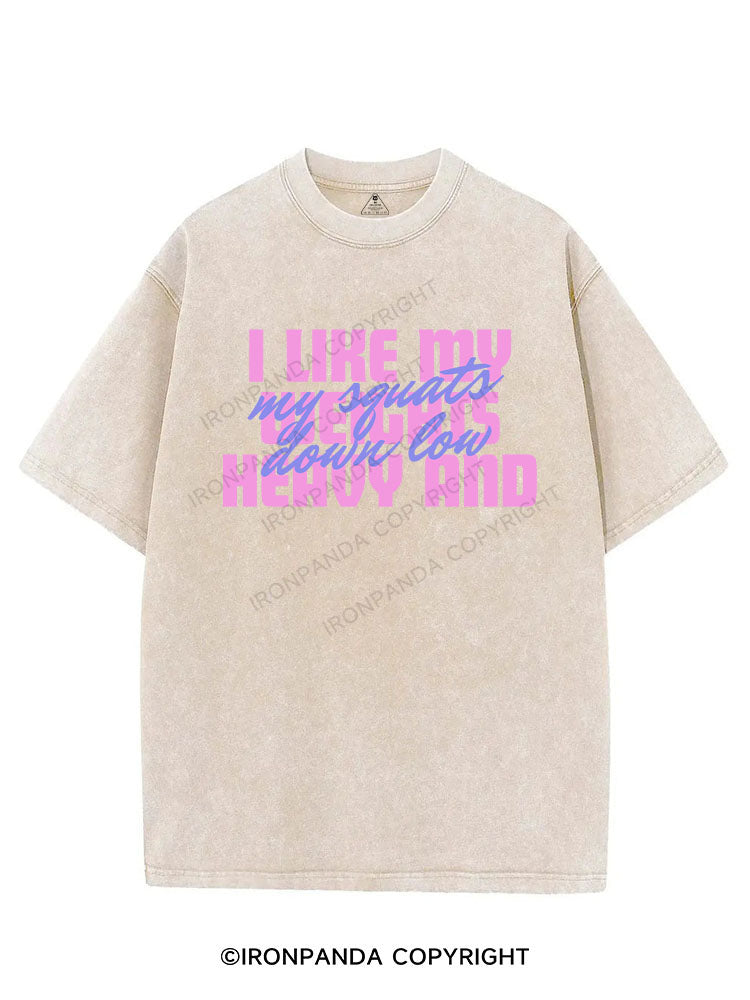 I LIKE MY WEIGHTS HEAVY AND MY SQUATS DOWN LOW VINTAGE GYM SHIRT