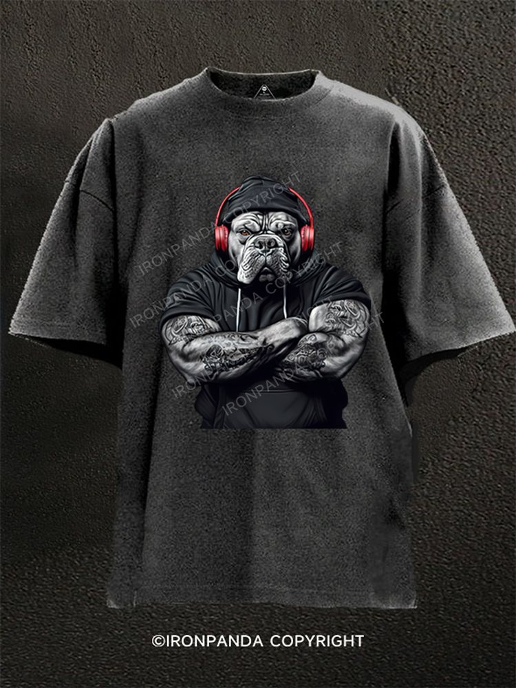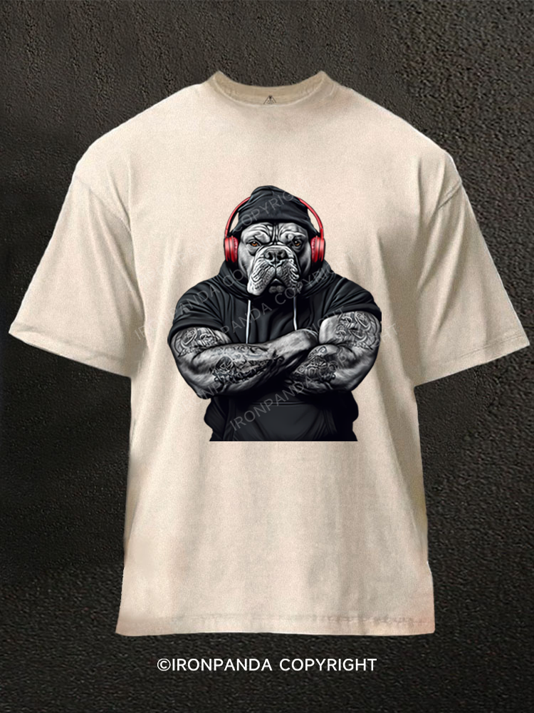 MUSCULAR BULLDOG WITH HEADPHONES Washed Gym Shirt