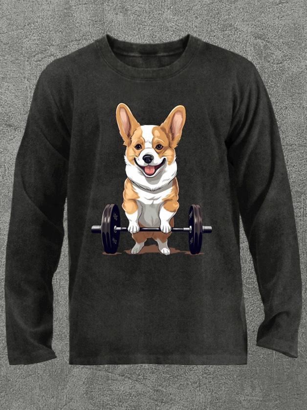 weightlifting dog corgi Washed Gym Long Sleeve Shirt